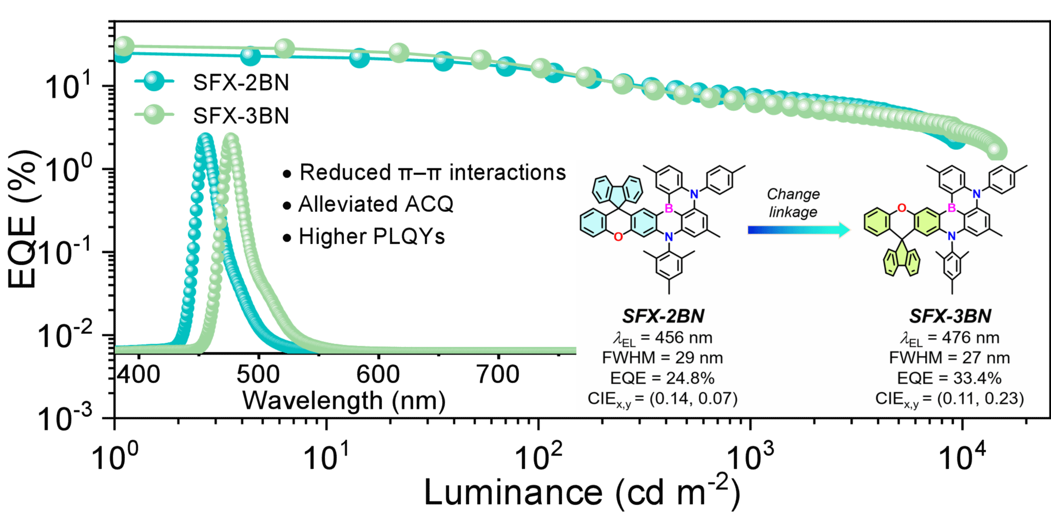 本研究提出一种在经典窄带发光材料DABNA核心内外围特定位置融合螺环基团策略,制备了两个蓝色TADF材料:SFX-2BN(O-π-B)和SFX-3BN(O-π-N)。吸电子硼(B)和供电子氮(N)原子在氧周围的相对定位能够实现从天蓝色到纯蓝色的精确发光波长。刚性螺环结构充当分子内锁,有效抑制振动弛豫和π-π堆叠,两种异构体均实现了窄光谱发射(FWHM=20-22 nm)。它们在薄膜中表现出高光致发光量子产率(PLQY>90%)。相应的OLED的最大外量子效率(EQE)分别为24.8%和33.4%。此外,采用TADF辅助主体,基于SFX-2BN的器件增强至27.5%,同时保持出色的色彩纯度,CIE坐标为(0.14、0.06)接近BT.2020蓝色标准。这些结果揭示了在MR核心内特定位点通过螺环基团融合策略实现光谱窄化的关键见解。