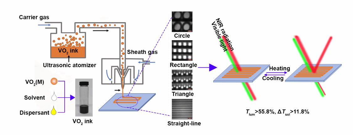近期,蒋绪川教授课题组在国际知名期刊Journal of Colloid and Interface Science上发表题为“High-resolution aerosol jet printing of periodic VO2 micropatterns for advanced smart windows”的研究工作。本研究通过可调控的气溶胶喷射打印技术,制备了VO2纳米颗粒墨水并实现图案化打印,成功构建了具有可控周期结构的微图案薄膜。通过调节打印速度、图案周期和间距等参数,可制备出光学性能可调的热致变色薄膜。相较于连续薄膜,微图案结构能在保持可见光高透过的同时,对太阳能调制性能影响甚微。通过优化打印速度与周期参数,本研究实现了ΔTsol=13.3%和Tlum=57.8%的性能突破,超越了现有二维多孔材料、仿生结构及丝网印刷技术的报道值。相较于空白玻璃,打印的VO2薄膜展现出优异的隔热性能,可使室内温度有效降低4.0°C,同时将冰块的融化时间延长8分钟。这种简便的制备工艺与创新的微图案设计,为VO2基智能窗的应用开辟了新的发展方向。