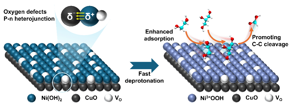 本研究设计并制备了具有丰富氧空位与p-n结界面的CuO@Ni(OH)2-x核壳纳米线,并在工业级电流密度下对EG/GLY转化为甲酸表现出高活性与高选择性。特别地,对于EGOR,CuO@Ni(OH)2-x在1.58 V(vs RHE)的超低电位下即可实现300 mA·cm-2的电流密度,且甲酸生成的法拉第效率约为99%。实验与理论分析表明:1)氧空位与p-n结协同调控Ni2+-OH的原子配位与电子结构,促进OH-吸附并降低O-H键断裂能垒,从而加速Ni3+OOH 的形成;2)氧空位使Ni3+高度暴露,增强了对EG/GLY的吸附及C-C键断裂能力,进而提升EG/GLY转化为甲酸的动力学。此外,设计太阳能驱动反应器结合物联网系统,用于实际PET瓶的升级循环,甲酸法拉第效率可达86.7%。本工作突出了镍基电催化剂中缺陷与p-n结的协同调控策略,为高效电氧化PET及生物质衍生醇类提供了新思路。相关工作“Synergistic Effects of Oxygen Defects and p-n Heterojunctions in CuO@Ni(OH)2-x Core-Shell Nanowires for Efficient Electrooxidation of PET Plastics and Biomass-Derived Alcohols”发表在ACS Sustainable Chemistry & Engineering (DOI: 10.1021/acssuschemeng.5c12471)上。